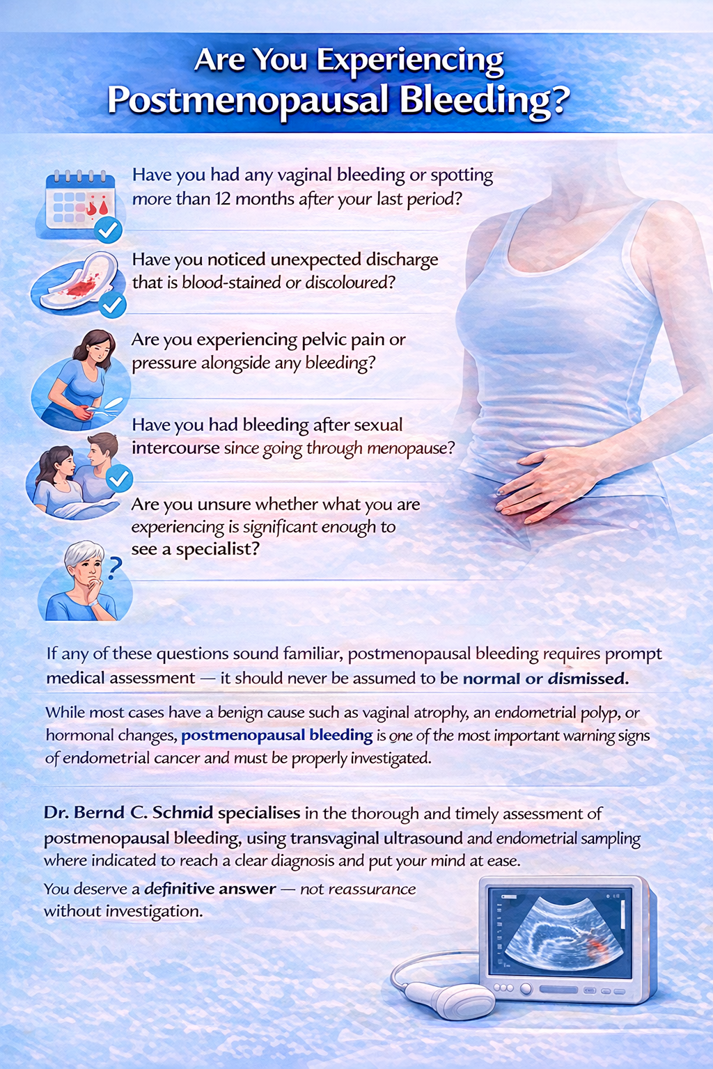 If any of these questions sound familiar, postmenopausal bleeding requires prompt medical assessment — it should never be assumed to be normal or dismissed. While most cases have a benign cause such as vaginal atrophy, an endometrial polyp, or hormonal changes, postmenopausal bleeding is one of the most important warning signs of endometrial cancer and must be properly investigated. Dr. Bernd C. Schmid specialises in the thorough and timely assessment of postmenopausal bleeding, using transvaginal ultrasound and endometrial sampling where indicated to reach a clear diagnosis and put your mind at ease. You deserve a definitive answer — not reassurance without investigation.